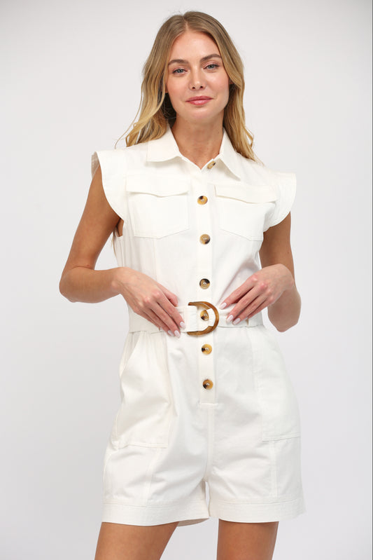 Sleeveless Belted Romper with Ruffle Caps