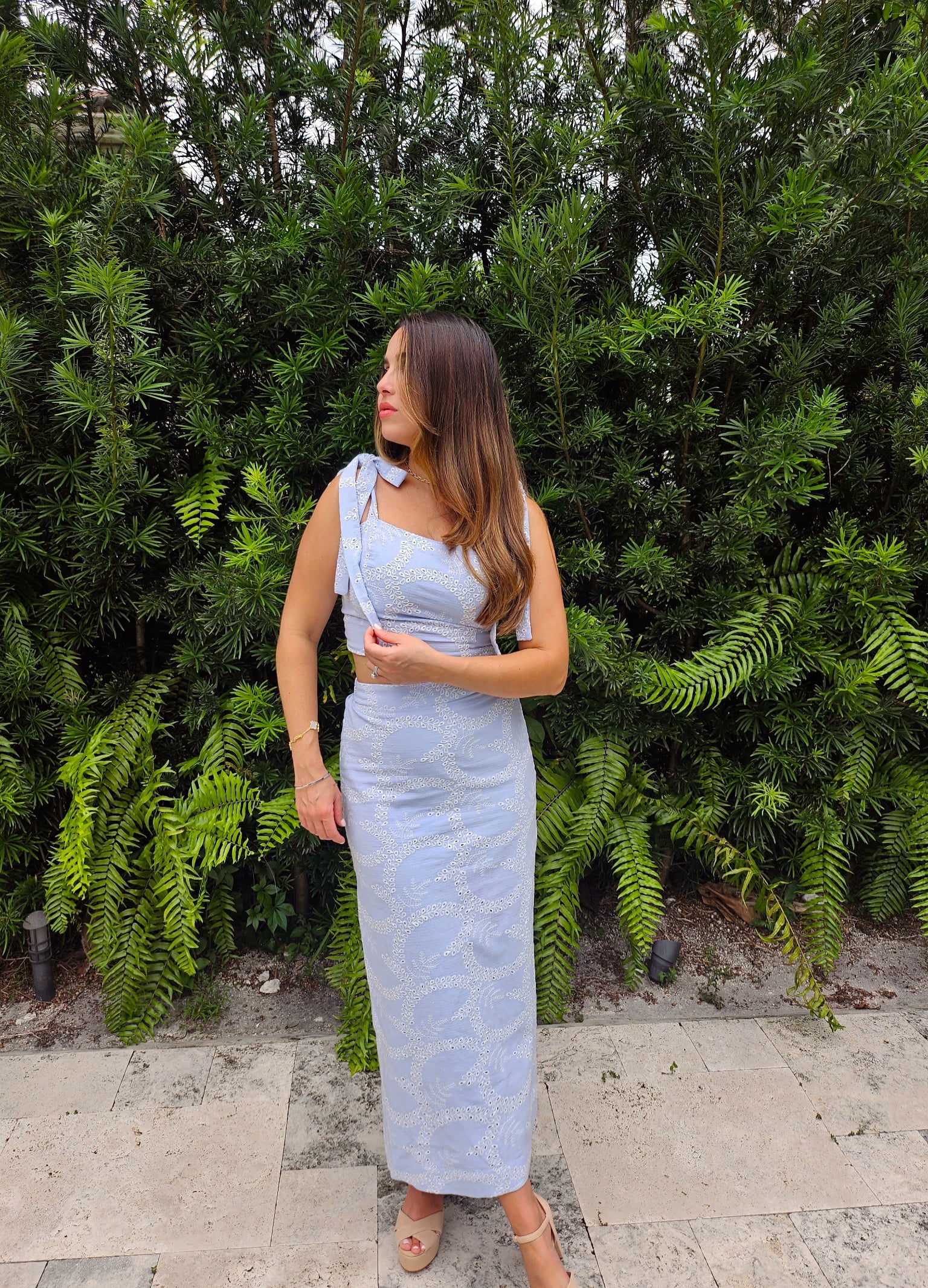 Embrace elegance with ease in our Celeste Set. This two-piece ensemble features a flattering square-neck crop top with tie sleeves and a coordinating high-waisted midi skirt. The soft powder blue fabric is detailed with a delicate, shimmering swirl print that adds a touch of sophistication. Perfect for garden parties, brunch dates, or seaside evenings.