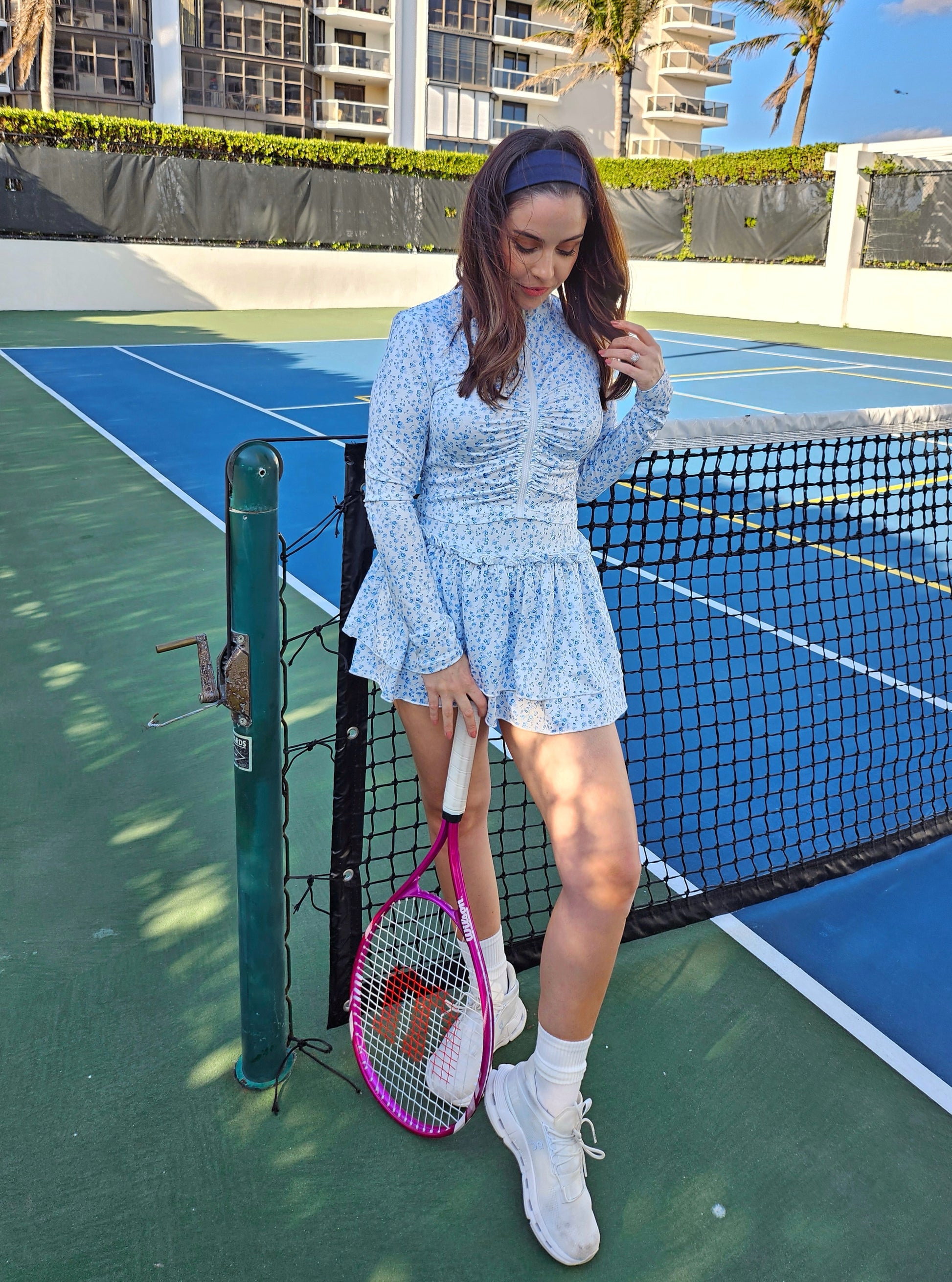Look stylish on the court for spring and summer with this floral zipper front jacket with a ruched center for a flattering fit. It's breathable and has a center-front zip making it perfect to pair with a sports bra underneath for an open or closed look. Pair it with the Ella floral skirt to complete the look!