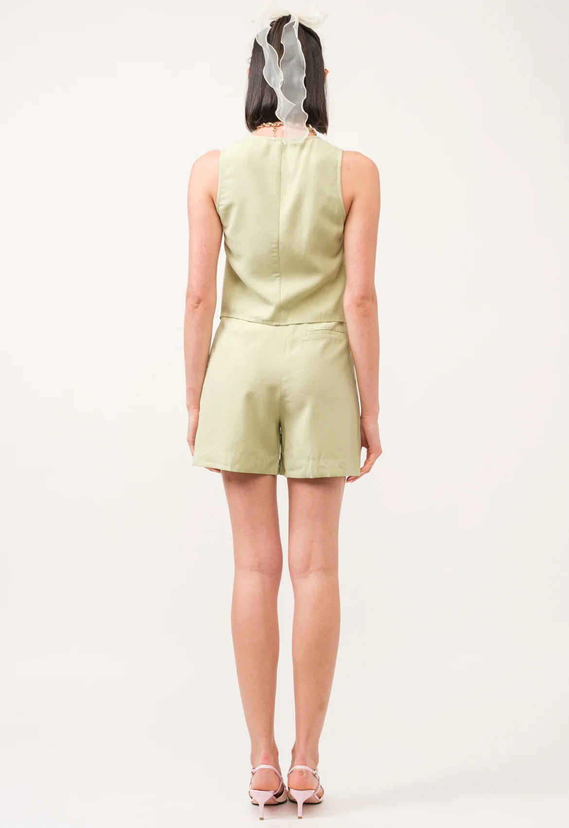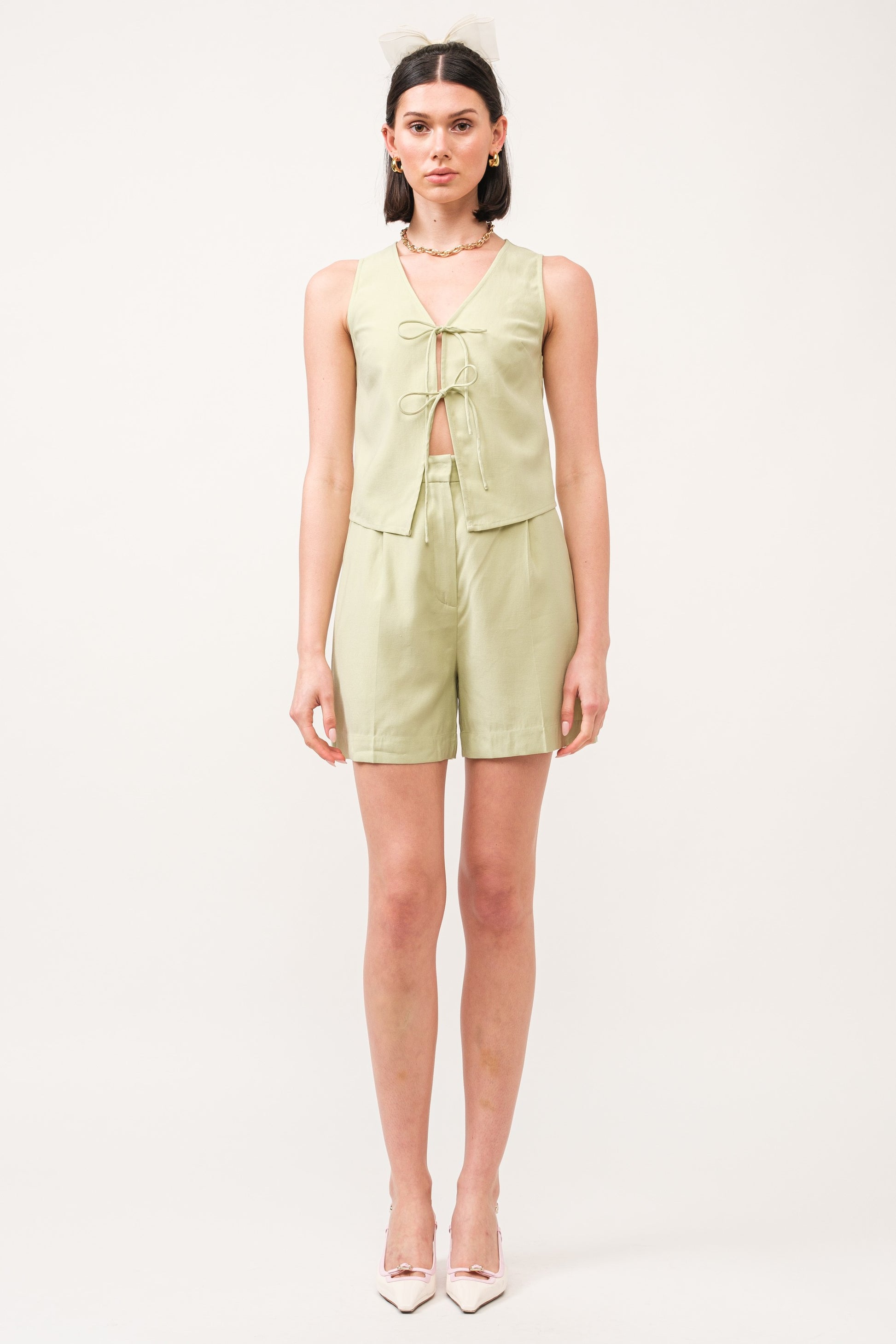 Step into effortless summer style with our Sun Seeker Linen Set – your go-to outfit for sunshine-filled days and balmy evenings. Crafted from a lightweight, breathable linen blend in a dreamy sage green hue, this two-piece set features a sleeveless tie-front top paired with high-waisted tailored shorts for a fresh, feminine silhouette.