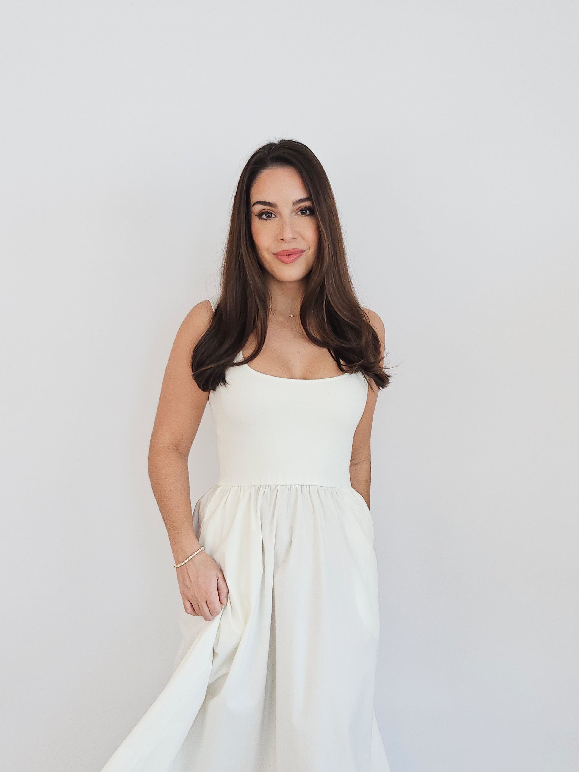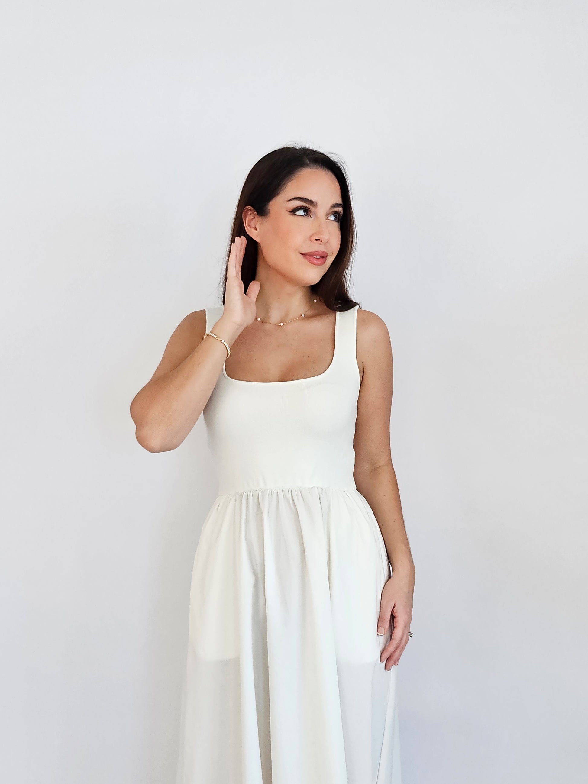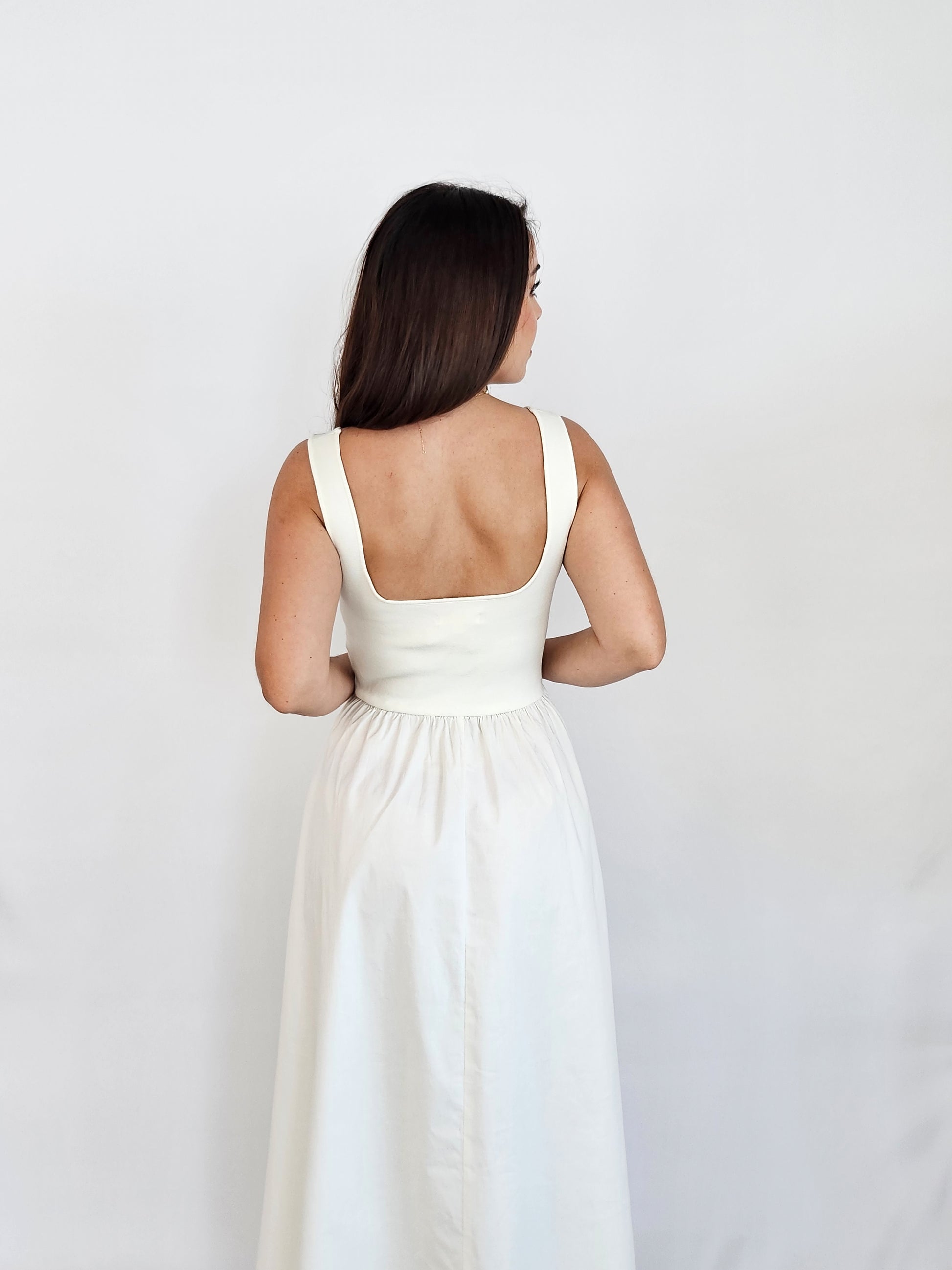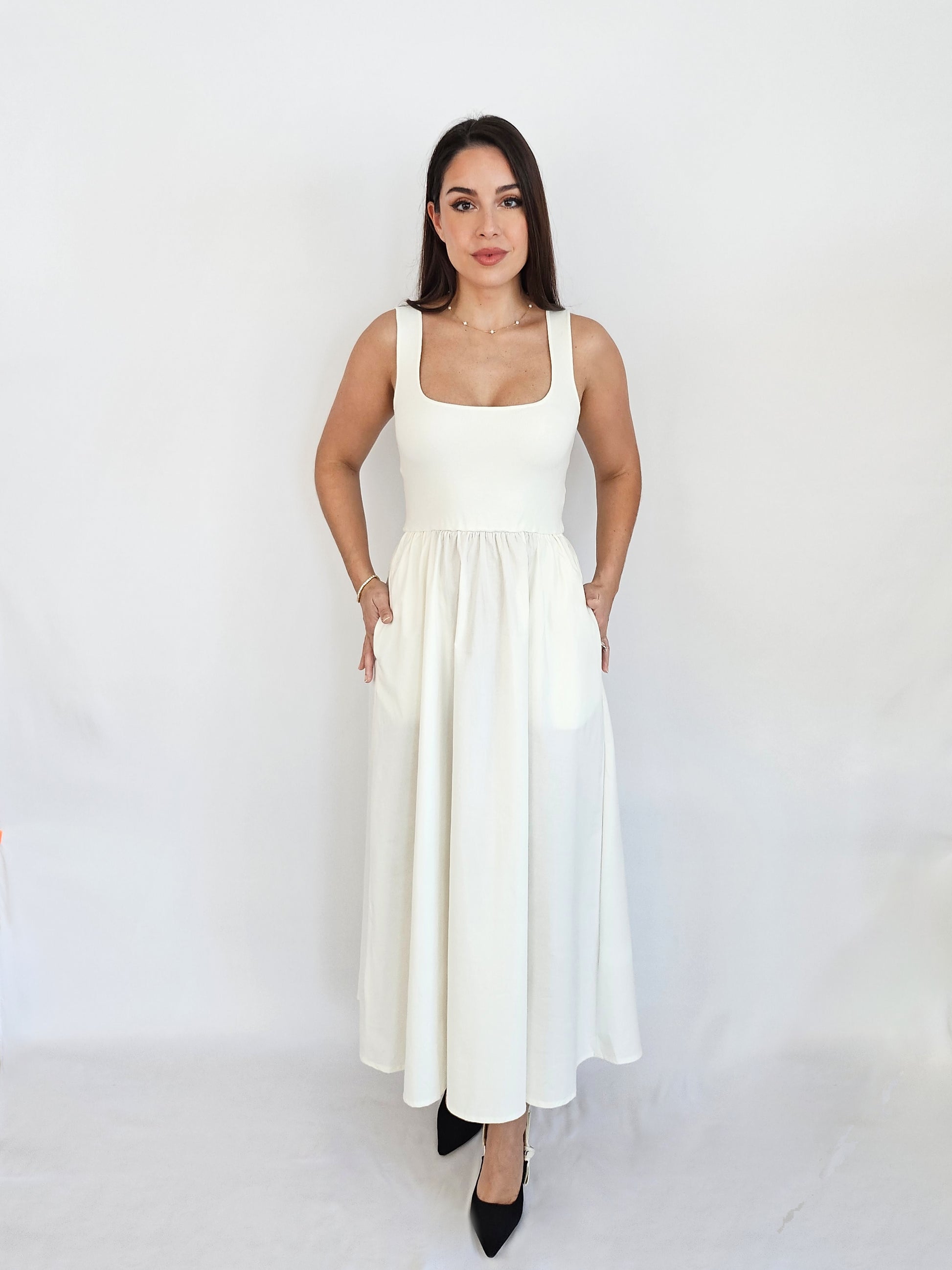 This white maxi-length knit dress has a square neckline top and a woven full skirt. The different fabrics create visual interest in this classic silhouette. This style also includes hidden side pockets making it the ideal option for on-the-go styling and versatile for different looks.